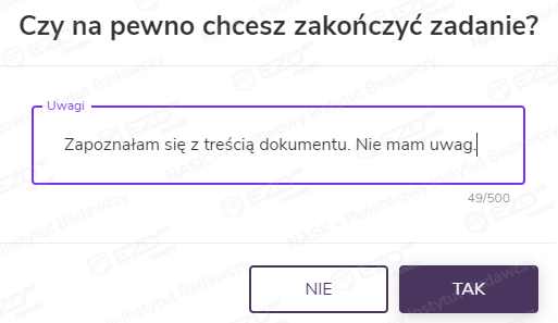 Kliknięcie opcji Zakończ zadanie wyświetli okno, w którym możliwe jest wpisanie ewentualnych uwag do udostępnionego dokumentu.