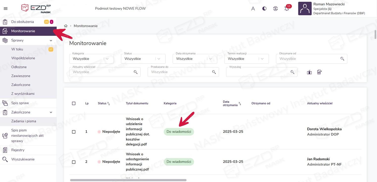 Przebieg realizacji zadania można również obserwować w module Monitorowanie. W tym miejscu odkładają się informacje o wszystkich wystawionych przez użytkownika zadaniach. Każde z zadań Do wiadomości pojawia się jako osobna pozycja na liście.