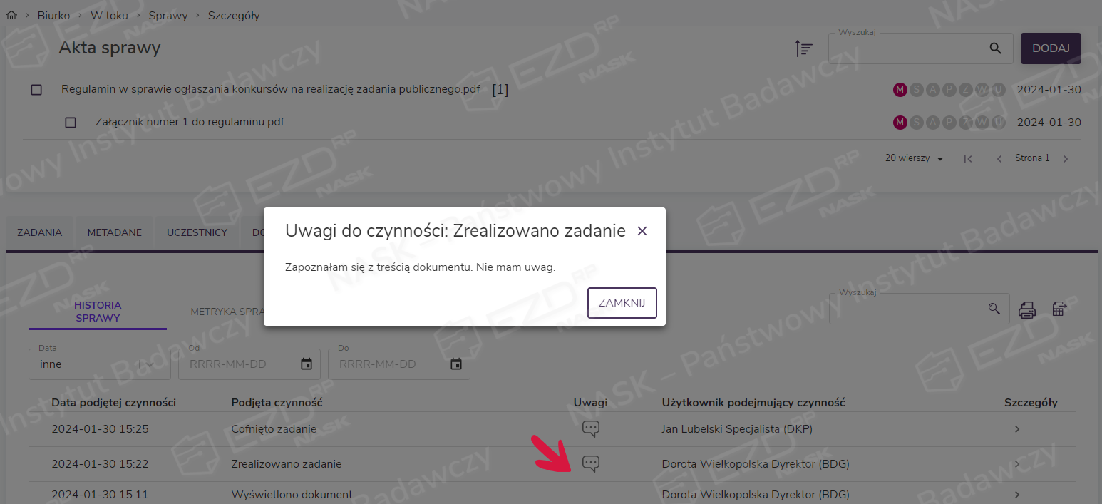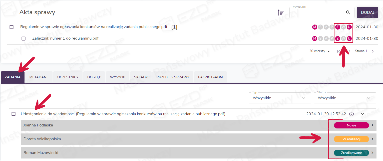 Właściciel sprawy, z której zadanie zostało wystawione i w której znajdują się udostępnione dokumenty, ma możliwość obserwowania etapu jego realizacji przez poszczególnych współpracowników. Gdy wszyscy zakończą wykonywać zadanie, ikony UZ przy dokumentach zostaną odbarwione. Natomiast uwagi, które odbiorcy zadania wpisali podczas zamykania, pojawią się w zakładce Przebieg sprawy, pod ikoną wiadomości.
