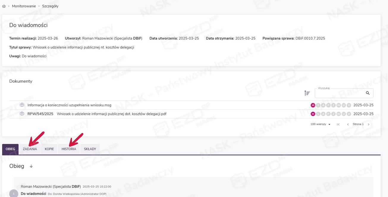 Po kliknięciu jednej z pozycji w module Monitorowanie można podejrzeć szczegóły zadania – m.in. zapoznać się z jego historią (w zakładce Historia) lub dowiedzieć się (w zakładce Zadania), komu odbiorca wystawił kolejne zadania Do wiadomości.