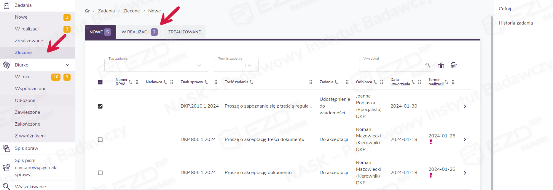 Przebieg realizacji zadania można również obserwować w module Zadania > Zlecone. W tym miejscu odkładają się informacje o wszystkich wystawionych przez użytkownika zadaniach – czy to ze sprawy, czy z pism, czy też z innych zadań. Poszczególne zadania wyświetlają się w trzech zakładkach: Nowe, W realizacjiZrealizowane – w zależności od tego, jaki jest ich status u odbiorcy.