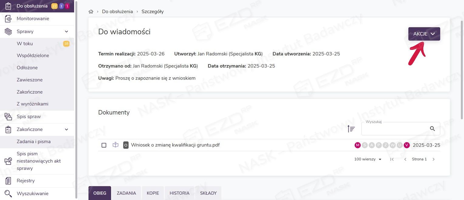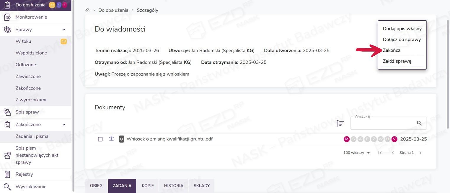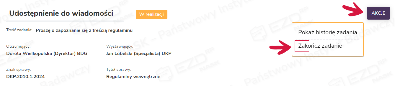Po zapoznaniu się z dokumentacją otrzymaną w zadaniu Do wiadomości należy je zakończyć. Opcja ta również znajduje się pod przyciskiem Akcje – w celu zakończenia zadania należy wybrać z listy pozycję Zakończ.