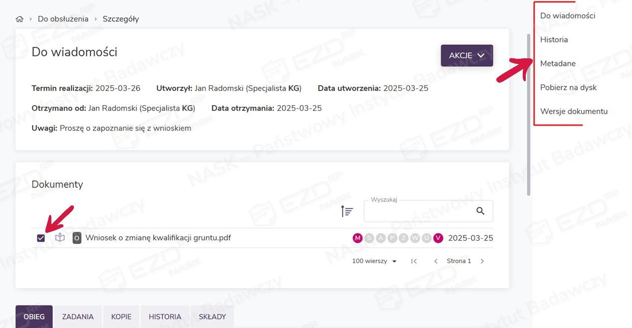 Po zaznaczeniu pola wyboru przy konkretnym dokumencie w menu kontekstowym z prawej strony ekranu pojawią się funkcje: Do wiadomości, Historia, Metadane, Pobierz na dysk oraz Wersje dokumentu. Opcja Do wiadomości pozwala na wystawienie na wskazanych dokumentach kolejnych zadań Do wiadomości.