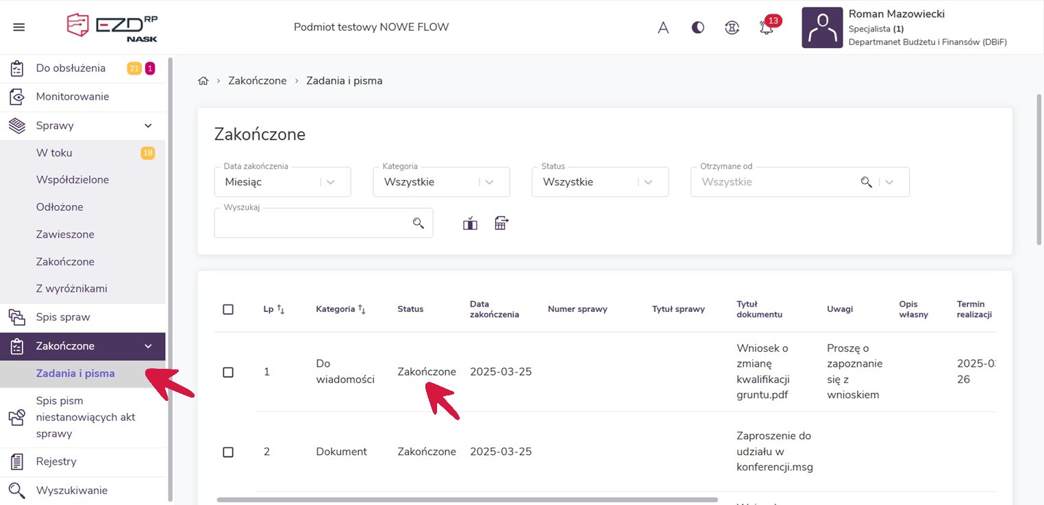 Po kliknięciu opcji Zakończ zadanie Do wiadomości zostanie przeniesione z sekcji Do obsłużenia do widoku Zakończone > Zadania i pisma. Z tego miejsca wciąż można podejrzeć jego szczegóły – jest to możliwe poprzez wybranie danej pozycji na liście.