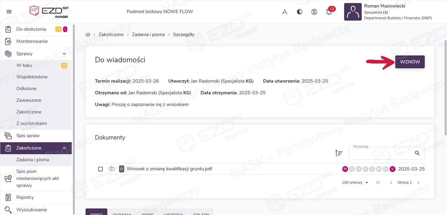 Po wejściu w szczegóły zakończonego zadania Do wiadomości można je wznowić przy pomocy przycisku Wznów. Przywrócone w ten sposób zadanie wróci do sekcji Do obsłużenia.