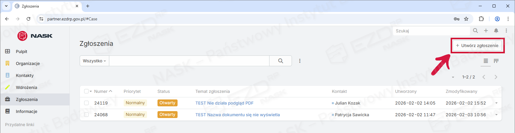 - W widoku listy zgłoszeń: kliknij przycisk Utwórz zgłoszenie.