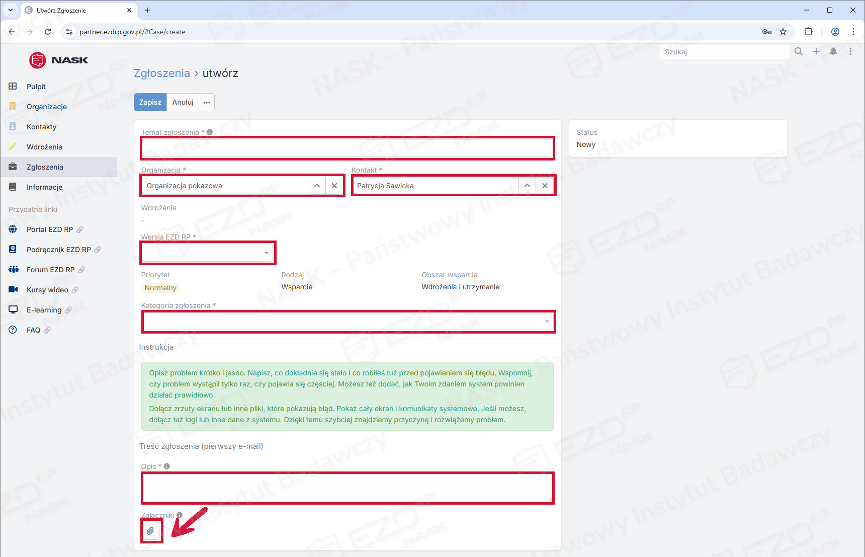 Szczegółowe wskazówki znajdziesz w artykule Przewodnik po tworzeniu poprawnych zgłoszeń do działu Service Desk EZD RP.