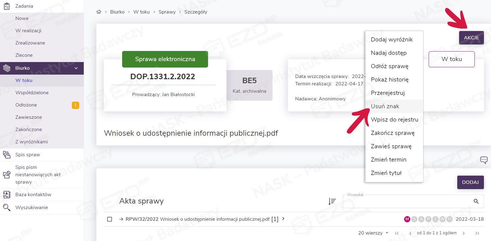 W przypadku błędnej rejestracji użytkownik ma możliwość usunięcia znaku sprawy. W tym celu przechodzi do widoku Biurko > W toku > Sprawy i wybiera interesująca go sprawę. Po przejściu do widoku szczegółów sprawy klika przycisk Akcje i wybiera z listy opcję Usuń znak.