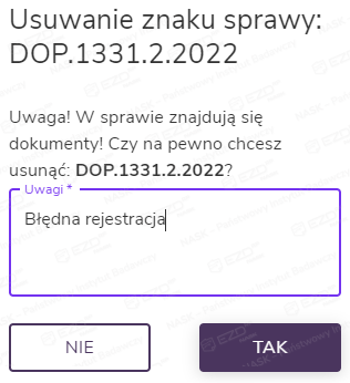 W przypadku wykonywania takiej zmiany konieczne jest podanie w nowym oknie powodu usunięcia znaku sprawy (obowiązkowe pole Uwagi) oraz zatwierdzenie operacji.
