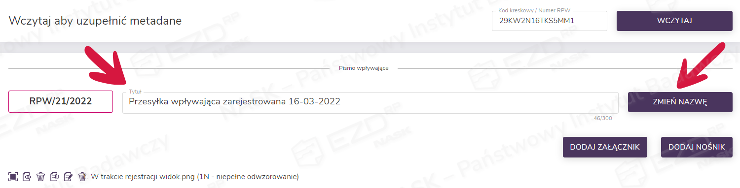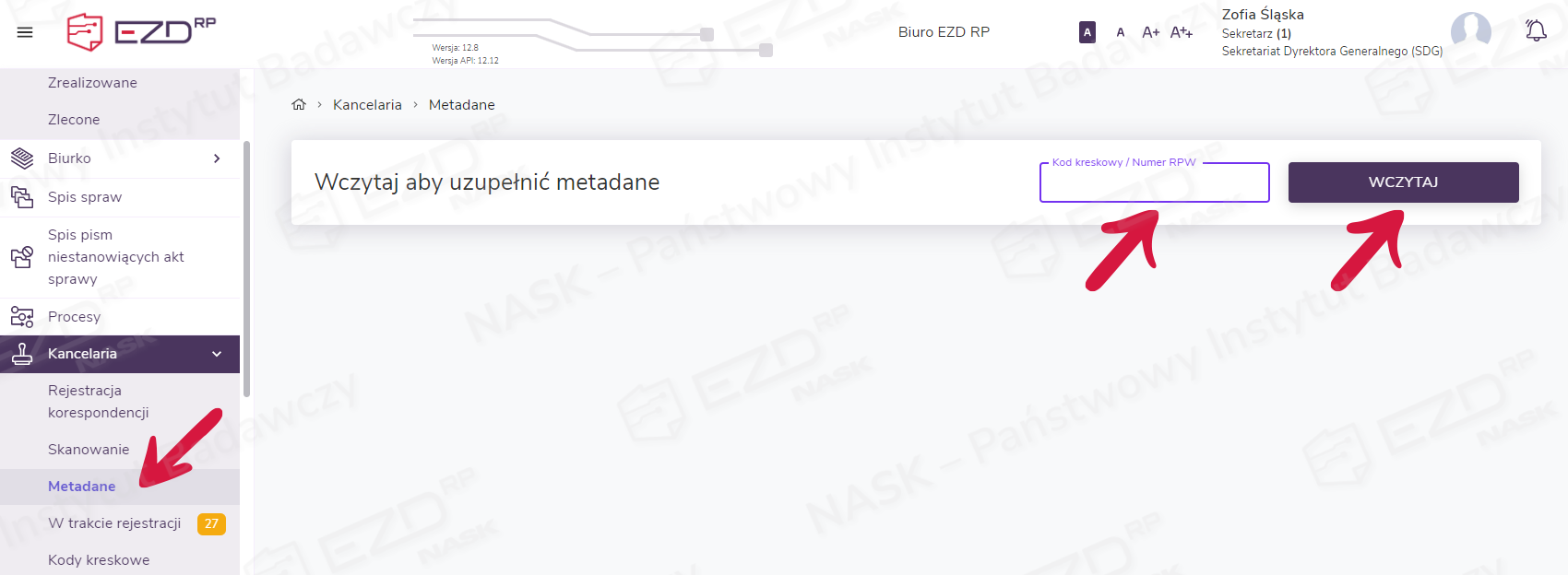 W systemie EZD RP metadane przesyłek wpływających uzupełniane są w sekcji Kancelaria > Metadane. Aby uzupełnić pole Kod kreskowy/Numer RPW, należy wczytać kod RPW wybranej przesyłki lub samodzielnie wpisać numer RPW. Zatwierdzamy wybór, klikając przycisk Wczytaj.