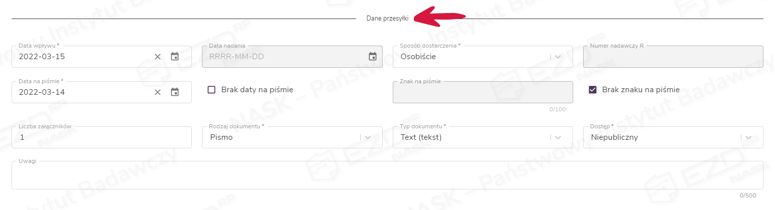 Na metadane opisujące przesyłkę wpływającą składają się m.in. dane, które możemy odczytać z przesyłki (np. data nadania, imię i nazwisko lub nazwa nadawcy), sposób jej dostarczenia, typ dokumentu, liczba załączników itd. Każda przesyłka otrzymuje w systemie EZD RP automatycznie nadany identyfikator, unikatowy w całym zbiorze przesyłek wpływających, określany jako numer z rejestru prowadzonego dla danego roku kalendarzowego dla przesyłek wpływających. Zestaw metadanych i ich wymagalność określa załącznik do instrukcji kancelaryjnej, dostępny na stronach gov.pl – link do pobrania (plik PDF, Rozmiar: 6 MB).