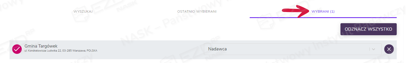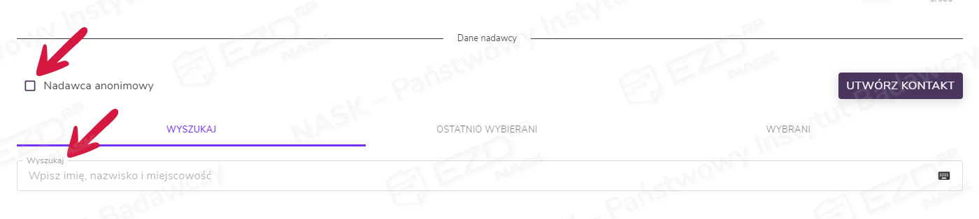 W kolejnym kroku należy uzupełnić dane nadawcy. Po wpisaniu kilku znaków w polu Wyszukaj system zaproponuje pasujące do danej frazy wpisy z bazy adresowej. Uwzględniane są: nazwy instytucji, imiona, nazwiska, nazwy miejscowości. W razie potrzeby można też skorzystać z opcji Nadawca anonimowy.