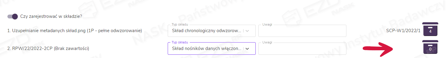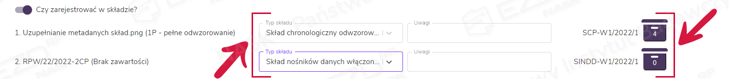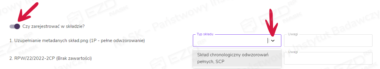 W kolejnym kroku system umożliwia zarejestrowanie wpływu w odpowiednim składzie chronologicznym. W tym celu należy zaznaczyć opcję Czy zarejestrować w składzie? i wskazać typ składu, wybierając odpowiednią pozycję z listy rozwijanej. W polu Uwagi można wprowadzić krótki opis rejestrowanego dokumentu.