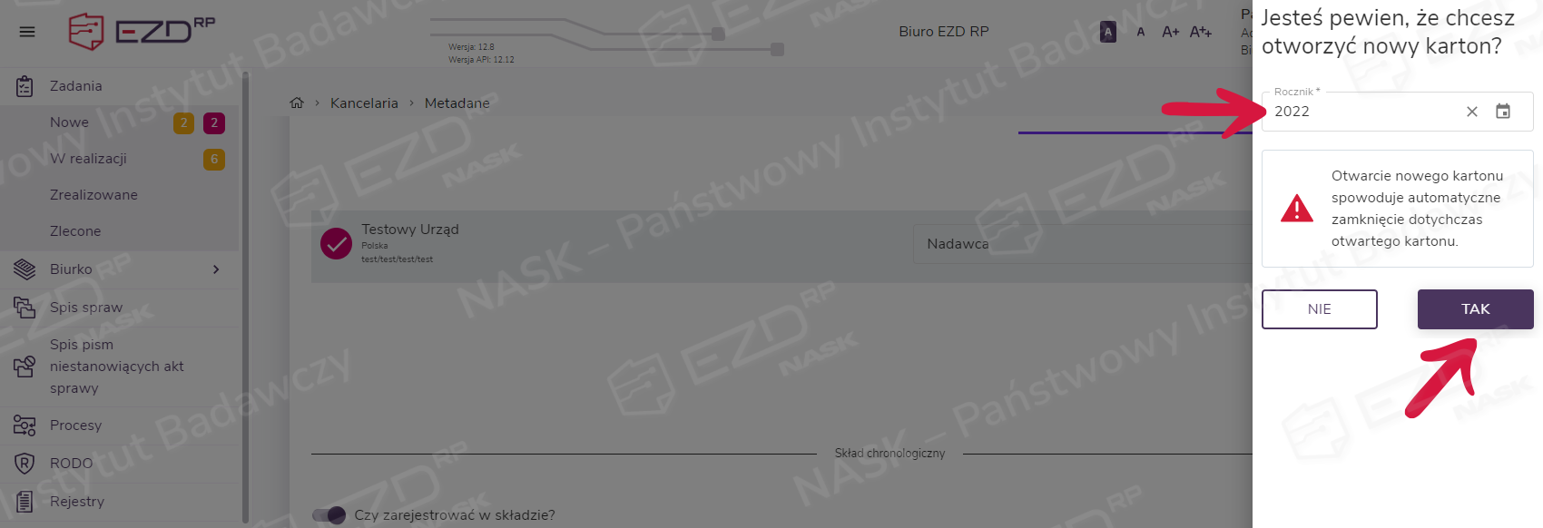 Aby otworzyć nowy karton, należy kliknąć ikonę kartonu. Zostanie wyświetlony panel boczny, w którym użytkownik musi wskazać rocznik kartonu oraz potwierdzić chęć jego utworzenia, klikając przycisk Tak. Obok ikony kartonu, która była pozbawiona opisu, zostanie dodany opis składu chronologicznego do kartonu.