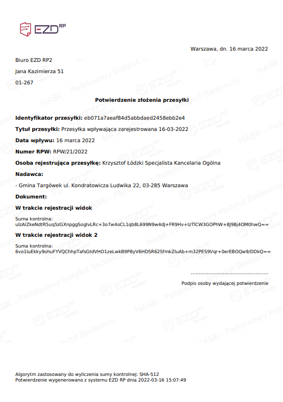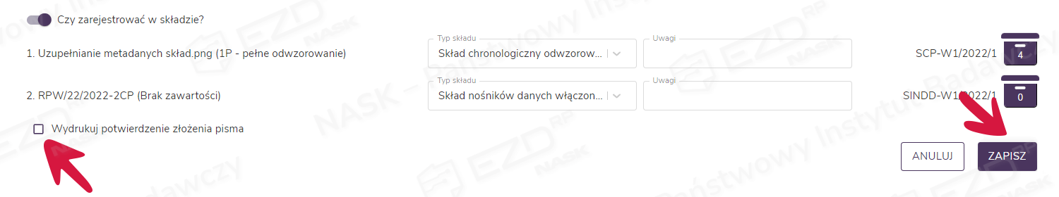 System umożliwia wydrukowanie potwierdzenia złożenia pisma w przypadku jego osobistego złożenia przez nadawcę. W tym celu należy zaznaczyć pole wyboru przy opcji Wydrukuj potwierdzenie złożenia pisma, a następnie kliknąć przycisk Zapisz.