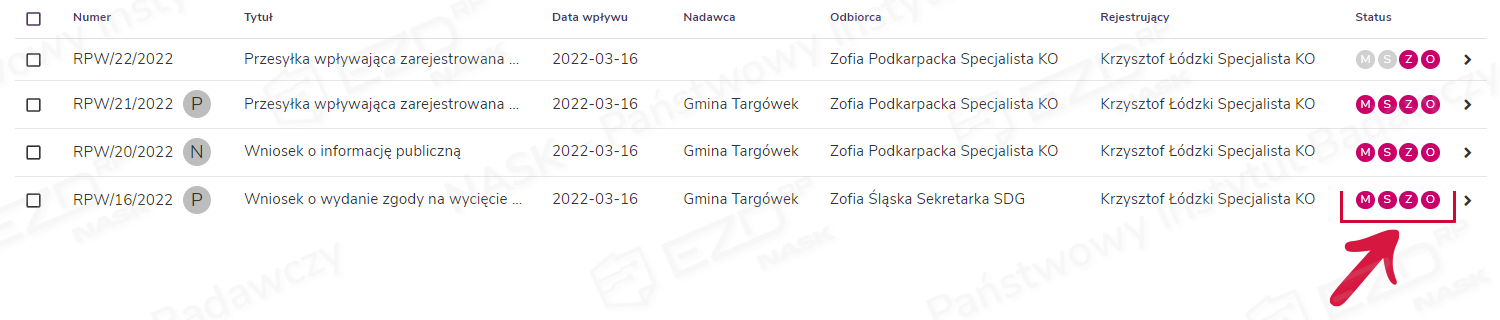 - Z – wygenerowaniu zadania rozdzielenia do osoby wskazanej podczas rejestracji dokumentu (jeśli uzupełniono metadane i dołączono jego odwzorowanie cyfrowe),