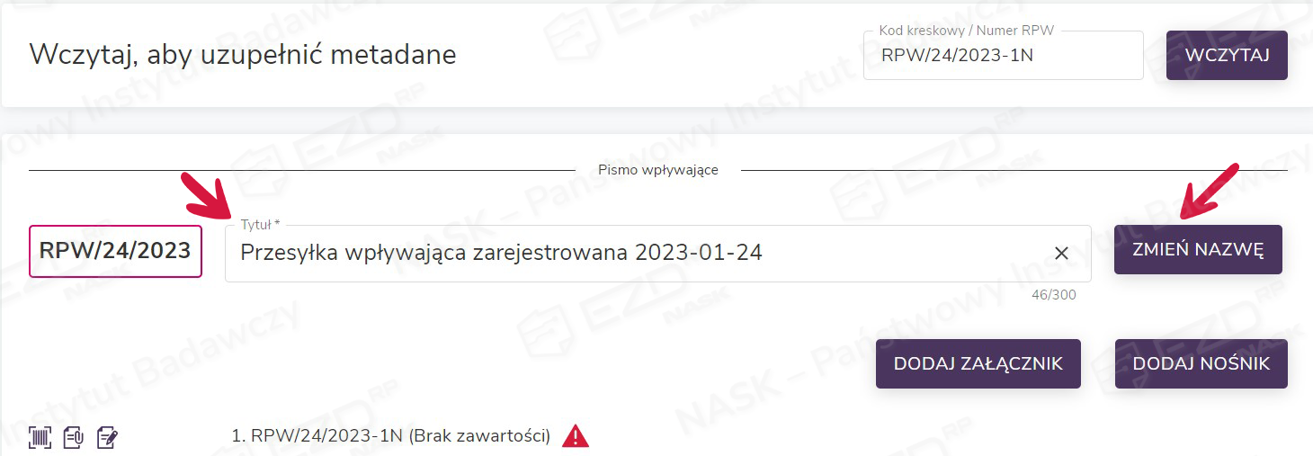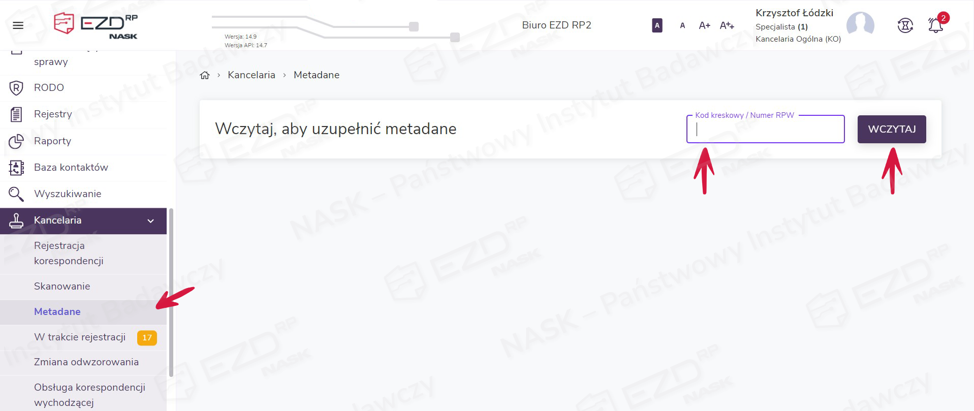 W systemie EZD RP metadane przesyłek wpływających uzupełniane są w sekcji Kancelaria > Metadane. Aby uzupełnić pole Kod kreskowy/Numer RPW, należy wczytać kod RPW wybranej przesyłki lub samodzielnie wpisać numer RPW. Zatwierdzamy wybór, klikając przycisk Wczytaj.