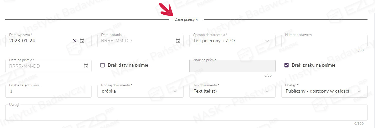 Na metadane opisujące przesyłkę wpływającą składają się m.in. dane, które możemy odczytać z przesyłki (np. data nadania, imię i nazwisko lub nazwa nadawcy), sposób jej dostarczenia, typ dokumentu, liczba załączników itd. Każda przesyłka otrzymuje w systemie EZD RP automatycznie nadany identyfikator, unikatowy w całym zbiorze przesyłek wpływających, określany jako numer z rejestru prowadzonego dla danego roku kalendarzowego dla przesyłek wpływających. Zestaw metadanych i ich wymagalność określa załącznik do instrukcji kancelaryjnej, dostępny na stronach gov.pl – link do pobrania (plik PDF, Rozmiar: 6 MB).