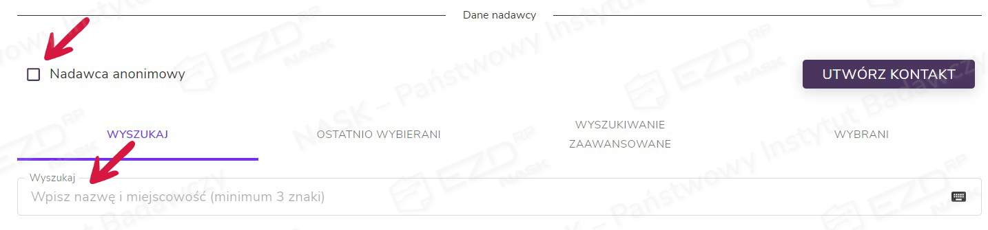 W kolejnym kroku należy uzupełnić dane nadawcy. Po wpisaniu kilku znaków w polu Wyszukaj system zaproponuje pasujące do danej frazy wpisy z bazy adresowej. Uwzględniane są: nazwy instytucji, imiona, nazwiska, nazwy miejscowości. W razie potrzeby można też skorzystać z opcji Nadawca anonimowy.