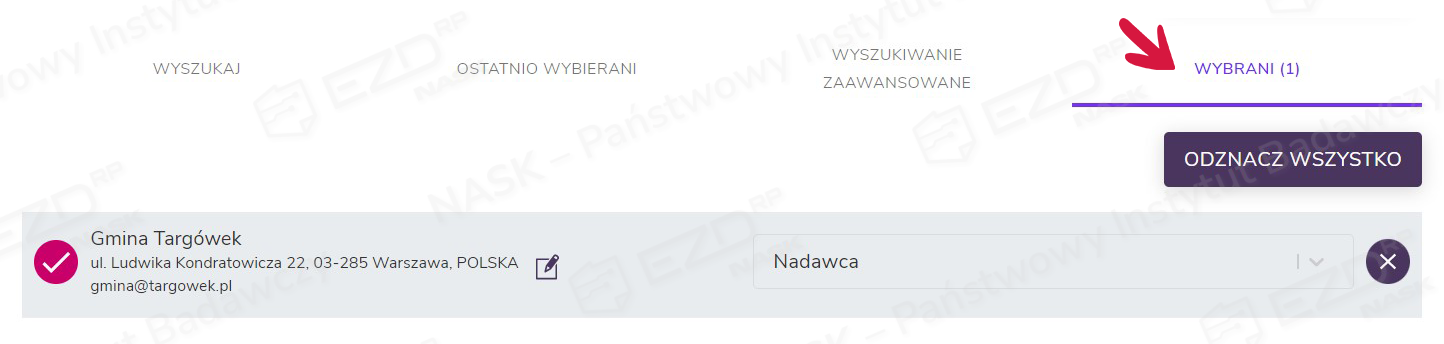 Wyszukanie nadawcy możliwe jest również w zakładce Ostatnio wybierani, w której odkładają się dane nadawców najczęściej wskazywanych, oraz w zakładce Wyszukiwanie zaawansowane. Ta ostatnia pozwala na wyszukiwanie kontaktów według precyzyjnie wskazanych atrybutów.