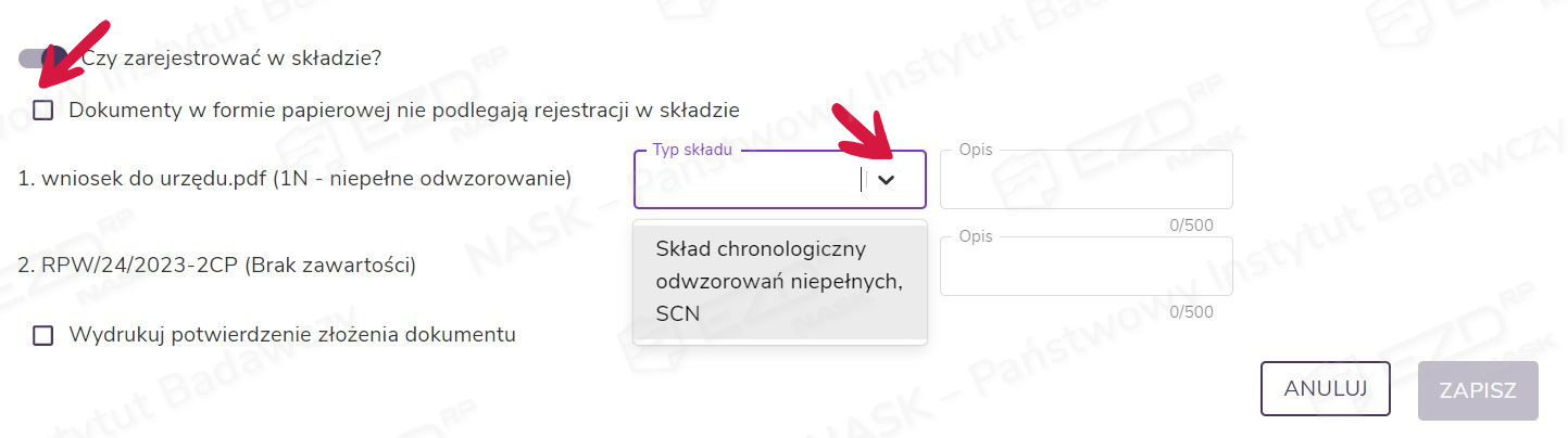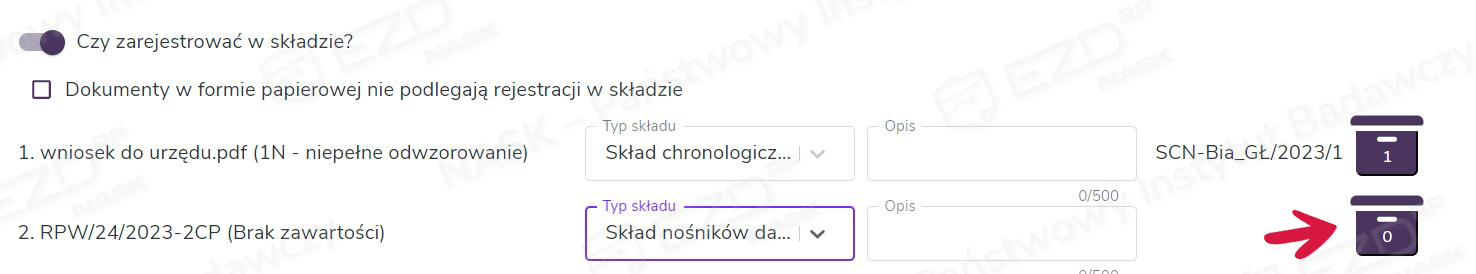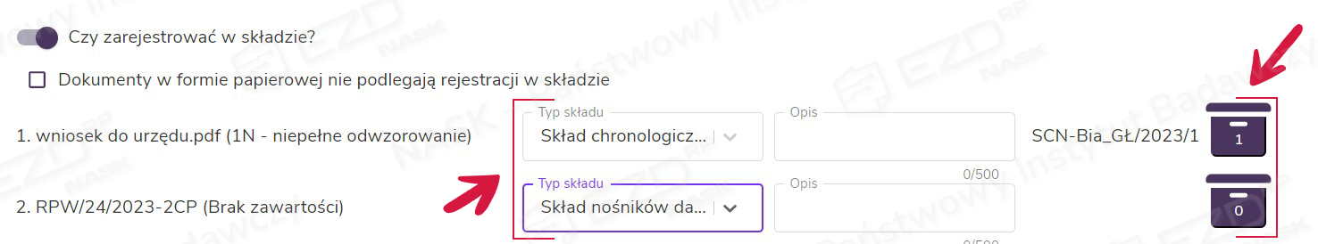 W kolejnym kroku system umożliwia zarejestrowanie wpływu w odpowiednim składzie chronologicznym. W tym celu należy zaznaczyć opcję Czy zarejestrować w składzie? i wskazać typ składu, wybierając odpowiednią pozycję z listy rozwijanej. Jeśli jednostka ma więcej składów chronologicznych, na liście wyświetlają się te, do których przypisany jest pracownik rejestrujący korespondencję. W polu Uwagi można wprowadzić krótki opis rejestrowanego dokumentu.