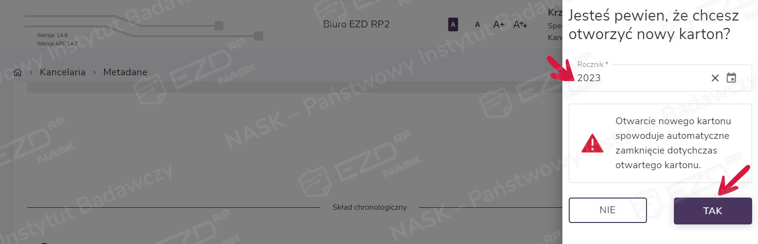 Aby otworzyć nowy karton, należy kliknąć ikonę kartonu. Zostanie wyświetlony panel boczny, w którym użytkownik musi wskazać rocznik kartonu oraz potwierdzić chęć jego utworzenia, klikając przycisk Tak. Obok ikony kartonu, która była pozbawiona opisu, zostanie dodany opis składu chronologicznego do kartonu.