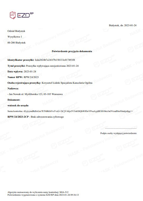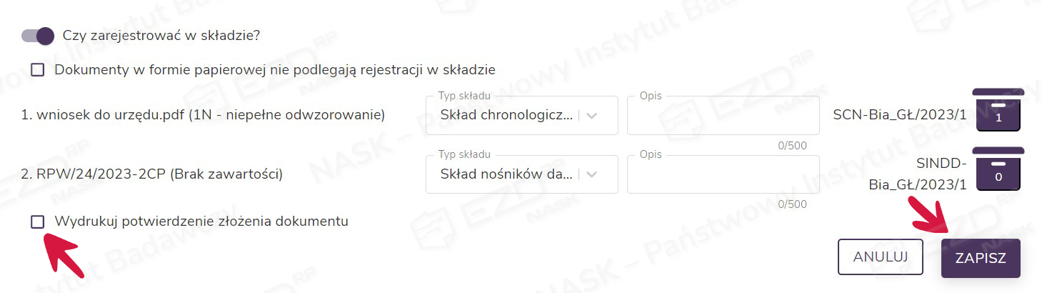 System umożliwia wydrukowanie potwierdzenia w przypadku osobistego złożenia pisma przez nadawcę. W tym celu należy zaznaczyć pole wyboru przy opcji Wydrukuj potwierdzenie złożenia pisma, a następnie kliknąć przycisk Zapisz.