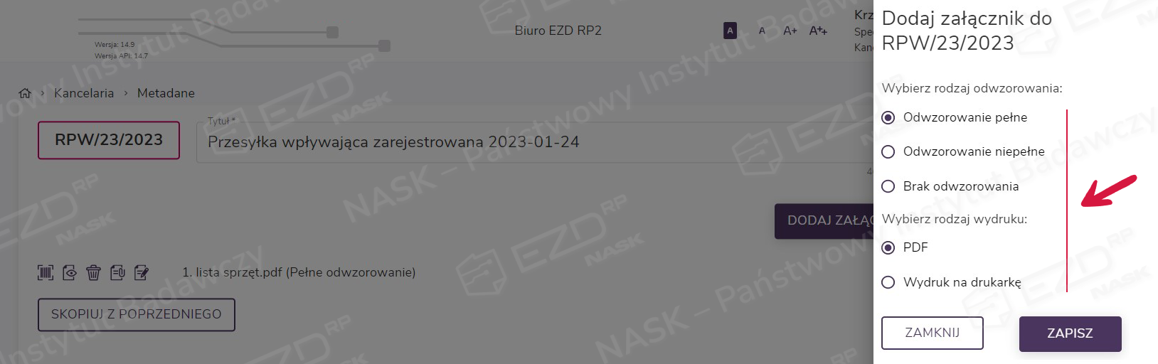 Istnieje możliwość dodania kolejnego załącznika lub nośnika do zarejestrowanej przesyłki. Po kliknięciu przycisku Dodaj załącznik lub Dodaj nośnik zostanie wyświetlony panel boczny, w którym użytkownik wskazuje rodzaj odwzorowania oraz rodzaj wydruku etykiety dla dodawanych dokumentów (możliwy jest wydruk bezpośrednio na drukarkę lub do PDF).
