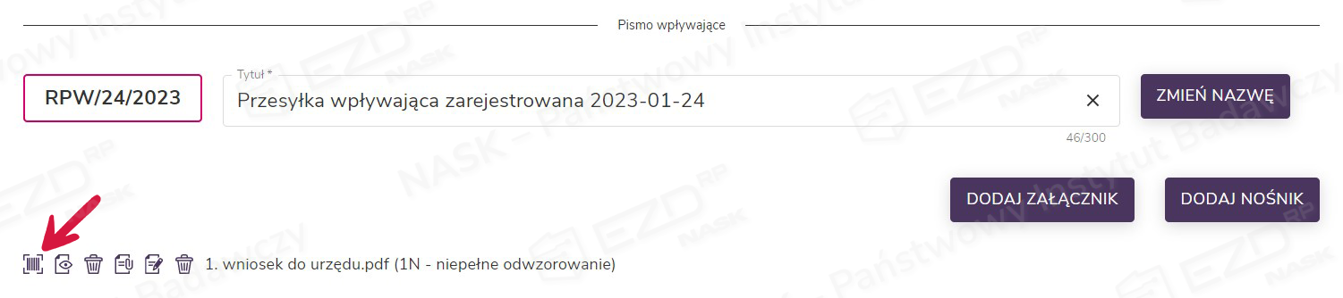 Ponowny wydruk kodu kreskowego (do PDF lub na drukarkę) jest możliwy po wybraniu ikony kodu znajdującej się przy załączniku.