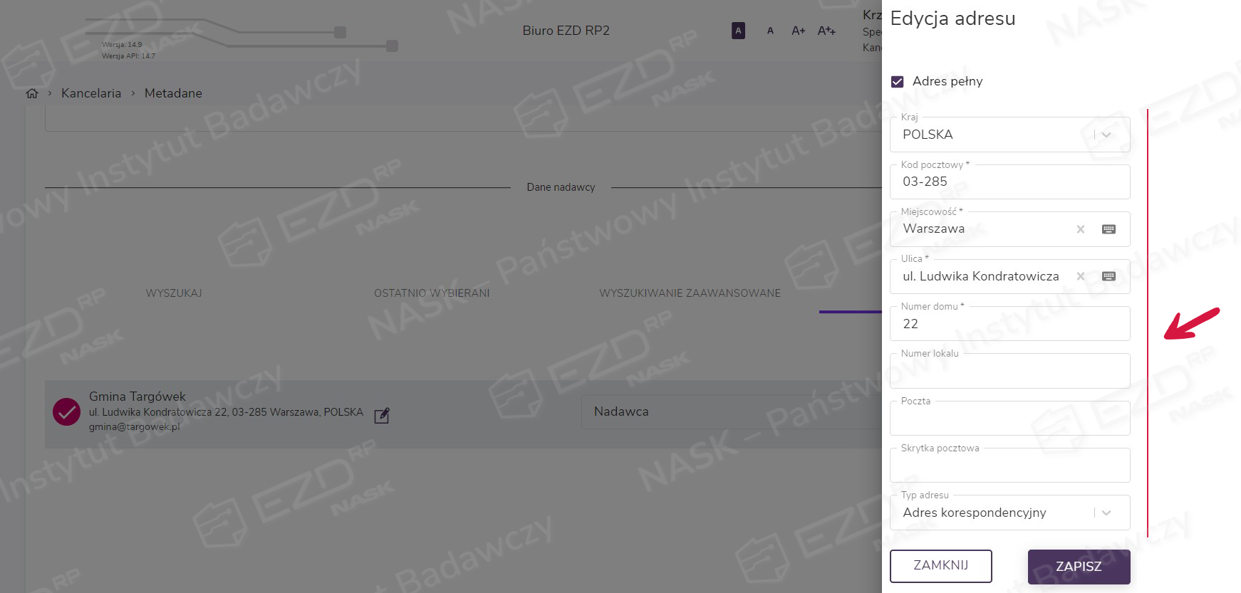 Adres wybranego adresata można edytować. W tym celu należy kliknąć ikonę z notesem. Zmianę danych adresowych należy potwierdzić przyciskiem Zapisz. Zostaną one zaktualizowane w bazie kontaktów.