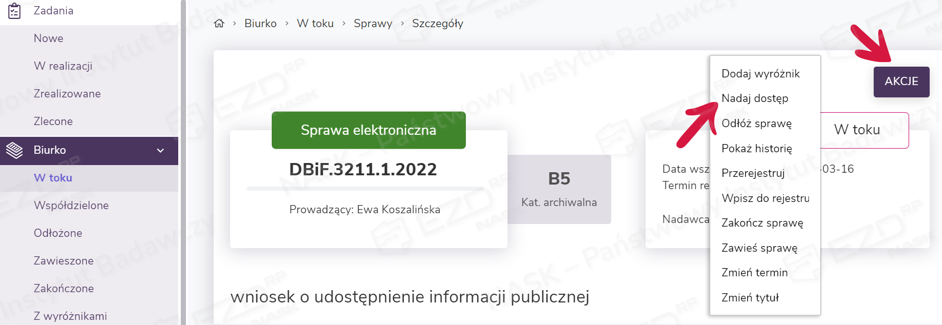 W celu nadania dostępu do sprawy użytkownik powinien przejść do widoku szczegółów danej sprawy, kliknąć przycisk Akcje i wybrać z menu funkcję Nadaj dostęp z poziomu szczegółów sprawy.