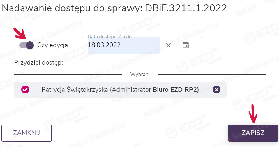 Jeśli termin nie zostanie ustawiony przez zapraszającego, dostęp do sprawy wygasa w momencie jej zakończenia. Obowiązkowo należy wskazać, jakiego rodzaju dostęp jest nadawany do sprawy: do odczytu czy do edycji.