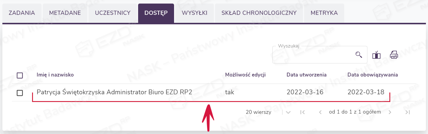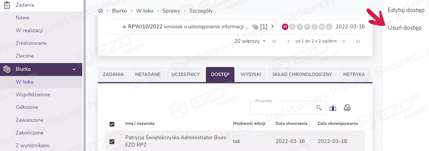 W widoku szczegółów sprawy znajduje się belka z zakładkami. W zakładce Dostęp, można znaleźć informacje, komu został nadany dostęp do sprawy (imię i nazwisko, stanowisko, skrót nazwy komórki organizacyjnej), jaki tryb dostępu został przydzielony (edycja, odczyt) oraz na jaki okres (początkowa i końcowa data przydzielonego dostępu). Z tego poziomu jest też możliwe odebranie lub zmiana (z edycji na odczyt lub odwrotnie) nadanych wcześniej dostępów.