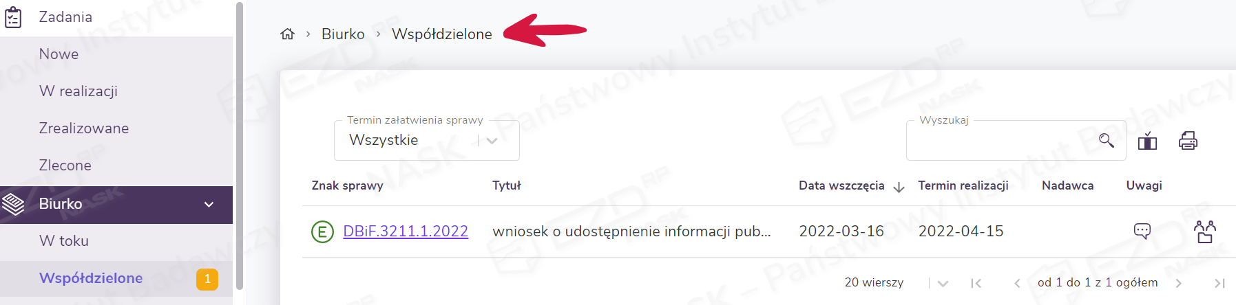 Osoba, która otrzymała dostęp do sprawy powinna zobaczyć ją na liście spraw współdzielonych w sekcji Biurko > Współdzielone.