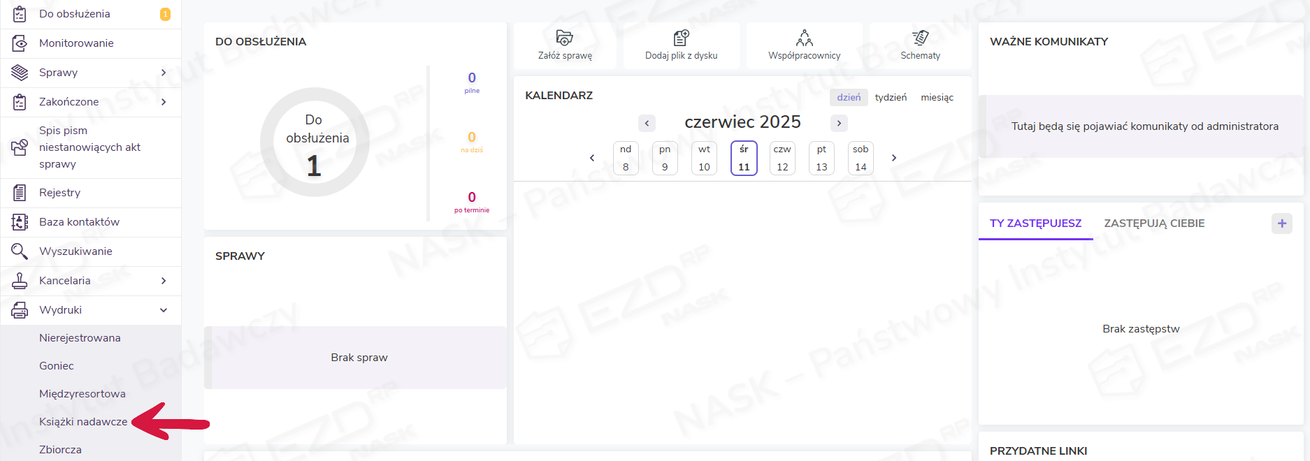 W celu wygenerowania zestawienia korespondencji wychodzącej należy kliknąć w głównym menu moduł Wydruki, a następnie sekcję Książki nadawcze.