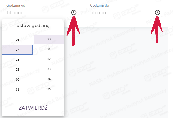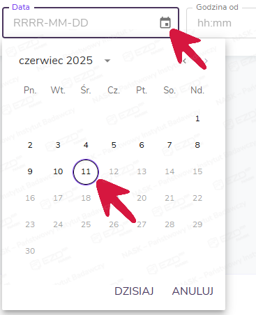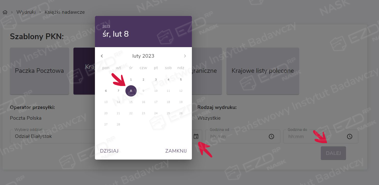 Następnie w polu Data należy wybrać dzień, dla którego chcemy wygenerować wydruk. Po kliknięciu ikony kalendarza wskazujemy dzień i zatwierdzamy wybór przyciskiem Dalej.