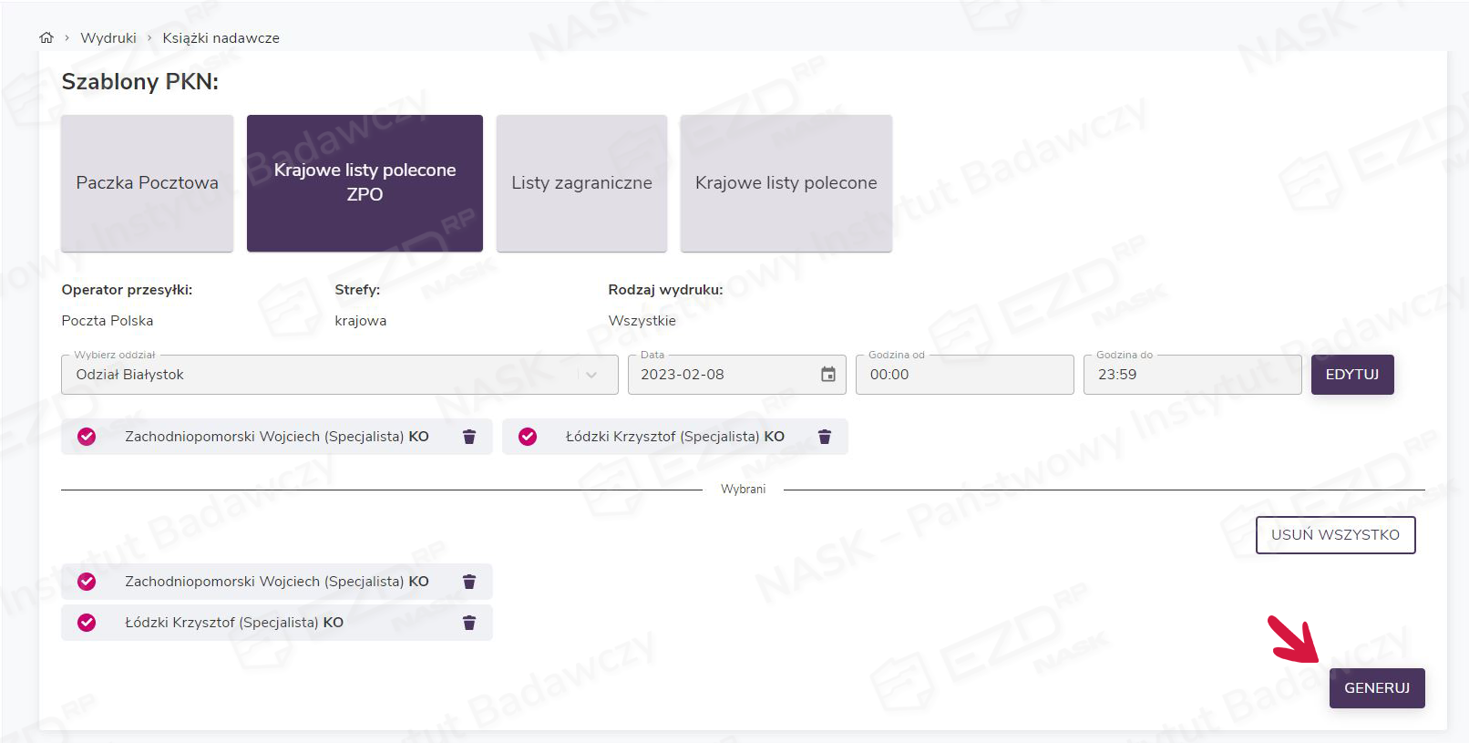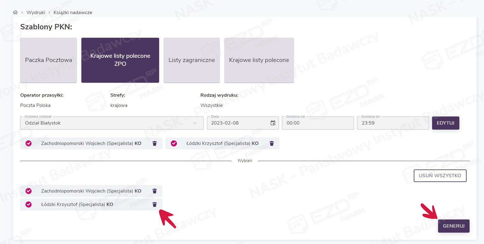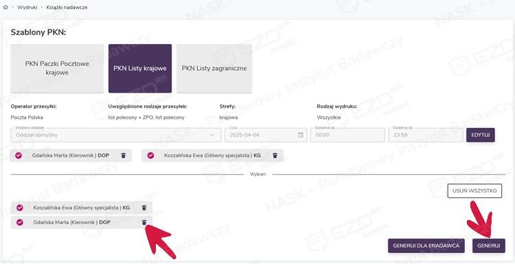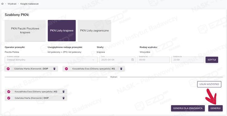 Ponadto system umożliwia wykonanie wydruków z podziałem na stanowiska. Aby wykonać taki wydruk, w widoku z wyświetlonymi użytkownikami, którzy są przypisani do wybranego oddziału i obsłużyli korespondencję we wskazanym terminie, przy użyciu ikony kosza usuwamy użytkowników, dla których w danej chwili nie chcemy wygenerować PKN. Następnie klikamy przycisk Generuj.