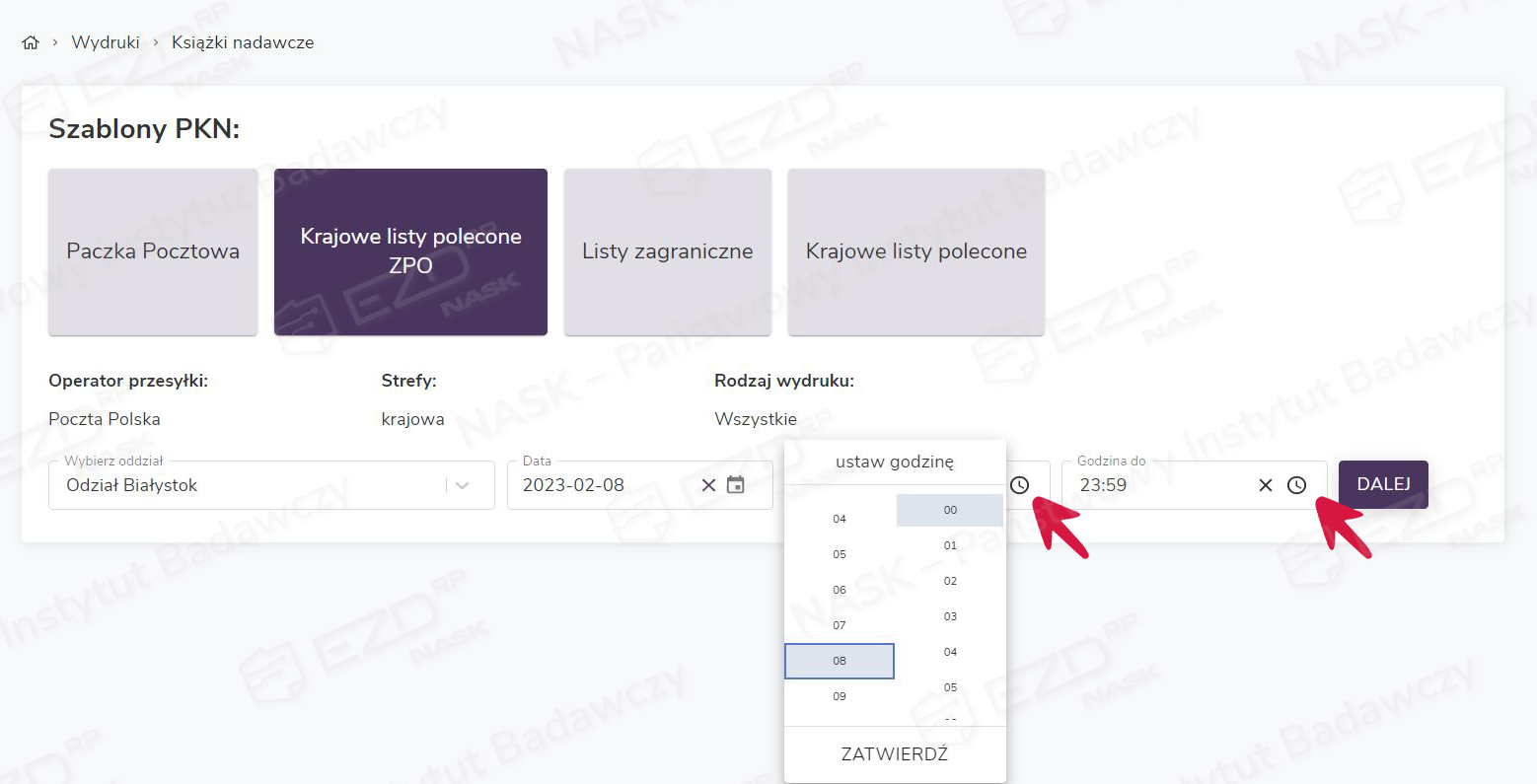 System umożliwia również wykonanie wydruków cząstkowych, np. po wskazaniu odpowiednich zakresów czasowych w polach Godzina odGodzina do. Pozwala to na generowanie wydruków dla korespondencji wychodzącej z organizacji w kilku turach, np. rano i po południu.