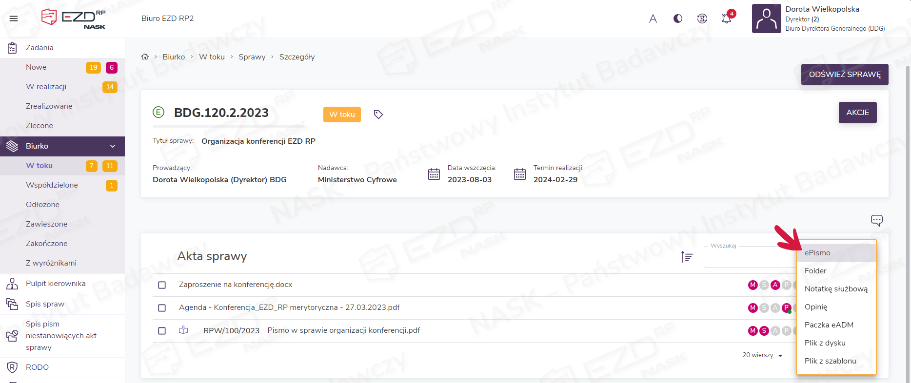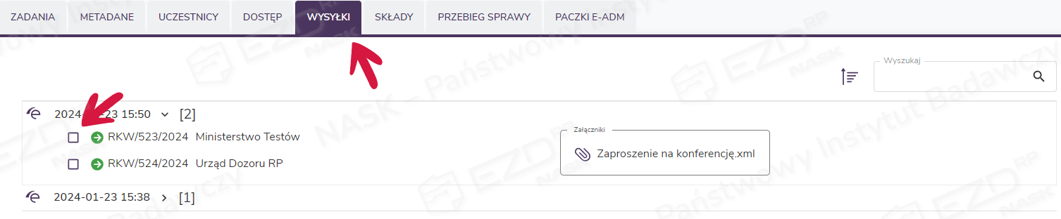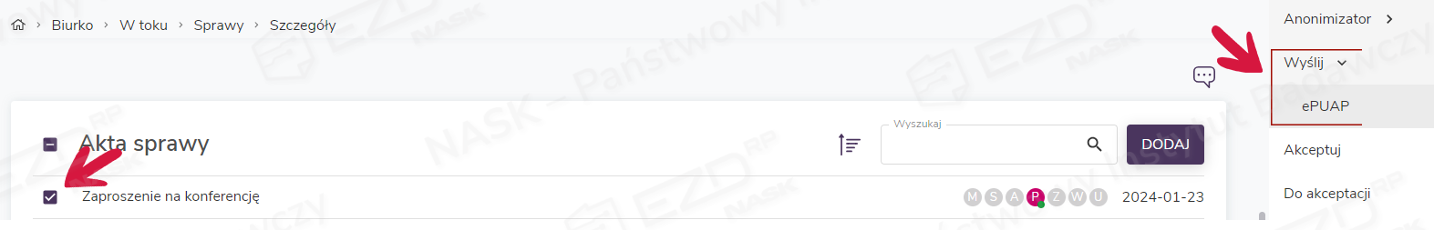 W systemie EZD RP wysłanie dokumentów przez ePUAP możliwe jest tylko z poziomu sprawy (Biurko > W toku > Sprawy > Szczegóły).