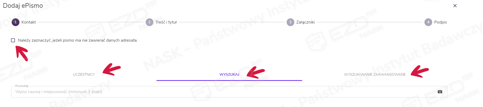 W pierwszym kroku należy wybrać adresata lub zaznaczyć, że pismo ma jego danych nie zawierać. Wskazać go można w zakładce Uczestnicy lub używając wyszukiwarki znajdującej się w zakładce Wyszukaj – poprzez wpisanie fragmentu albo całości imienia, nazwiska, nazwy czy miejscowości. Dostępne jest też wyszukiwanie zaawansowane – w tym przypadku należy wpisać precyzyjne dane adresata, które system ma uwzględnić podczas przeszukiwania bazy kontaktów.