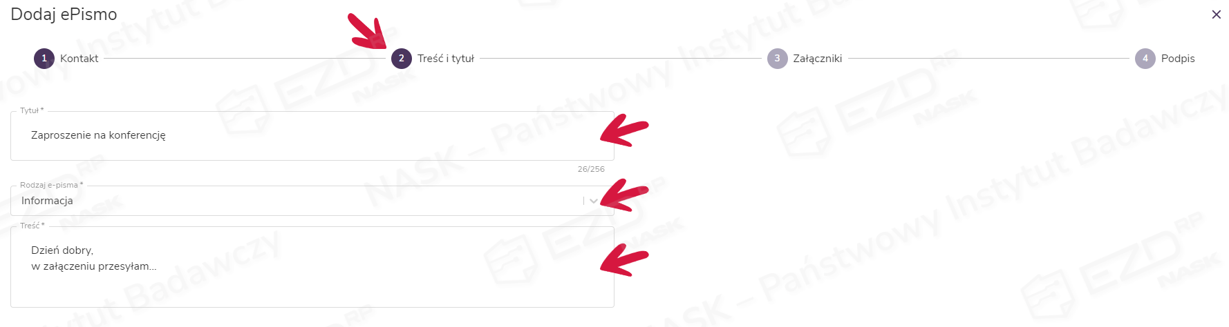 Wybranie z rozwijanego menu opcji ePismo spowoduje wyświetlenie okna Dodaj ePismo, w którym w kilku etapach można utworzyć dokument właściwy do wysyłki przez ePUAP.