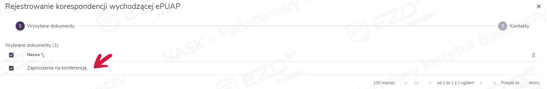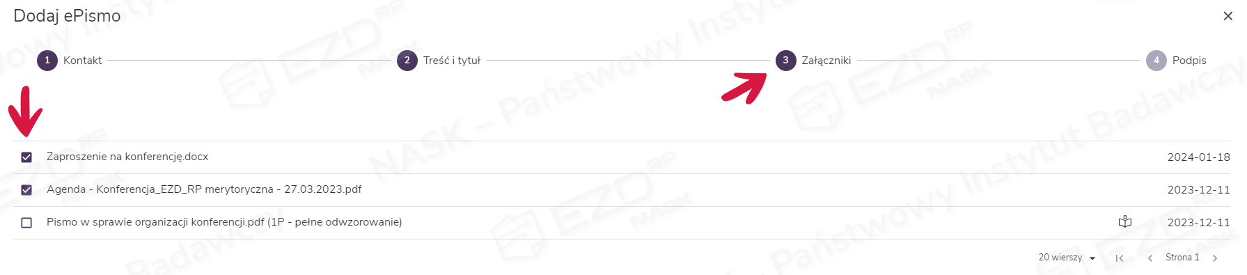 Po naciśnięciu przycisku Dalej przechodzimy do trzeciego kroku, w którym można dodać załączniki. System wyświetla tutaj wszystkie dokumenty z akt sprawy, które mogą zostać dołączone do ePisma.