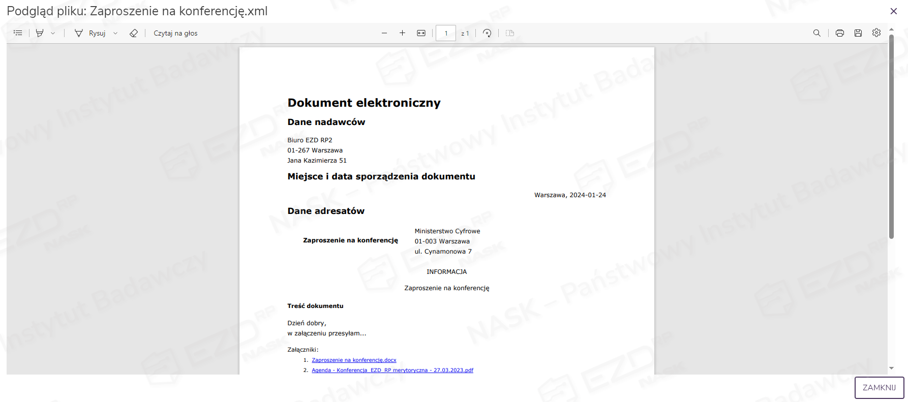 Po kliknięciu tytułu ePisma na ekranie wyświetlony zostanie jego podgląd w formacie PDF. Widoczne w nim będą załączniki, które zostaną wysłane razem z ePismem.
