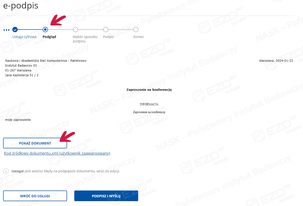Po wybraniu przycisku Tak system przekieruje użytkownika na stronę www.pz.gov.pl, gdzie w kilku krokach można podpisać pismo. Na etapie Podglądu widoczna jest część ePisma. W całości można je zobaczyć, klikając przycisk Pokaż dokument.