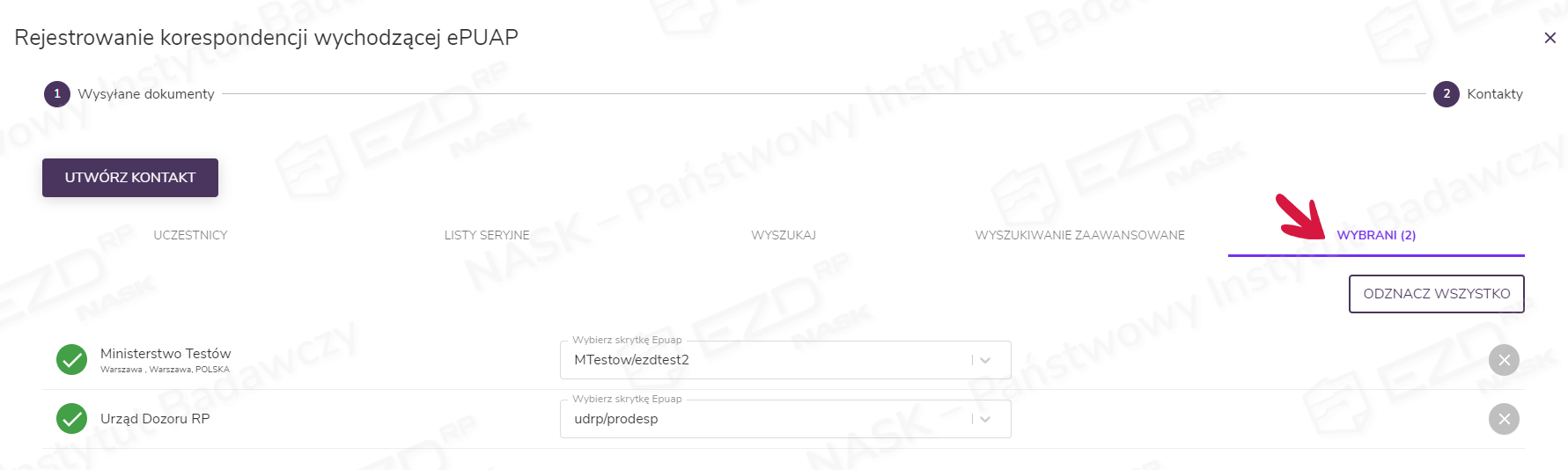 Wskazani przez użytkownika adresaci pojawią się w zakładce Wybrani. Generując wysyłkę, można w jednej operacji wskazać wielu odbiorców.