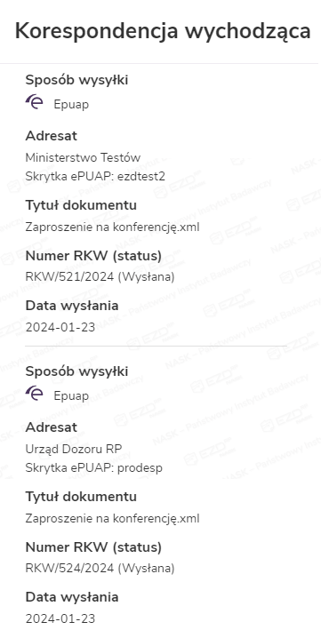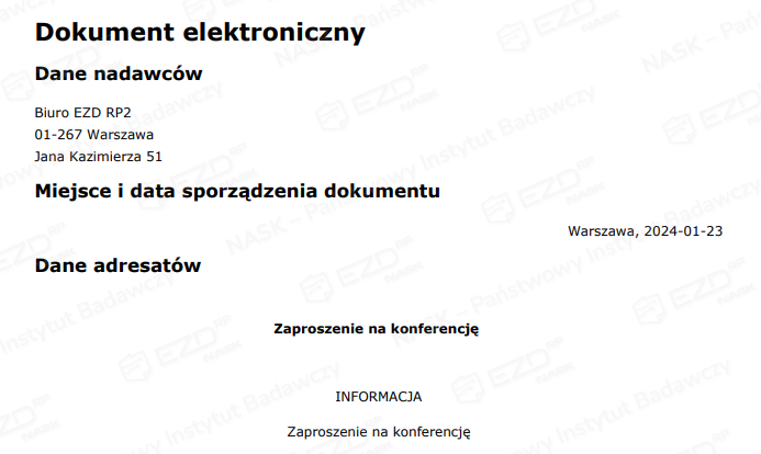 W zależności od tego, czy przesyłka ePUAP jest wysyłana do podmiotu, czy do osoby fizycznej, wysyłka zostaje zrealizowana albo w trybie UPP (urzędowe poświadczenie przedłożenia), albo w UPD (urzędowe poświadczenie dostarczenia). System EZD RP automatycznie określi odpowiedni tryb. Ponadto do dokumentu zostanie dołączone potwierdzenie (UPP dostępne będzie od razu, UPD – po odbiorze przesyłki). Kliknięcie UPP/UPD wygeneruje podgląd dokumentu.