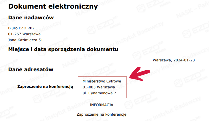 Decyzja o wyborze adresata bądź rezygnacji z tej możliwości nie będzie mieć znaczenia przy późniejszej wysyłce ePisma. Skorzystanie z tej funkcji spowoduje jedynie uzupełnienie danych w samym piśmie. Na poniższych grafikach zostały zobrazowane obie sytuacje – wskazania adresata i braku informacji na jego temat.