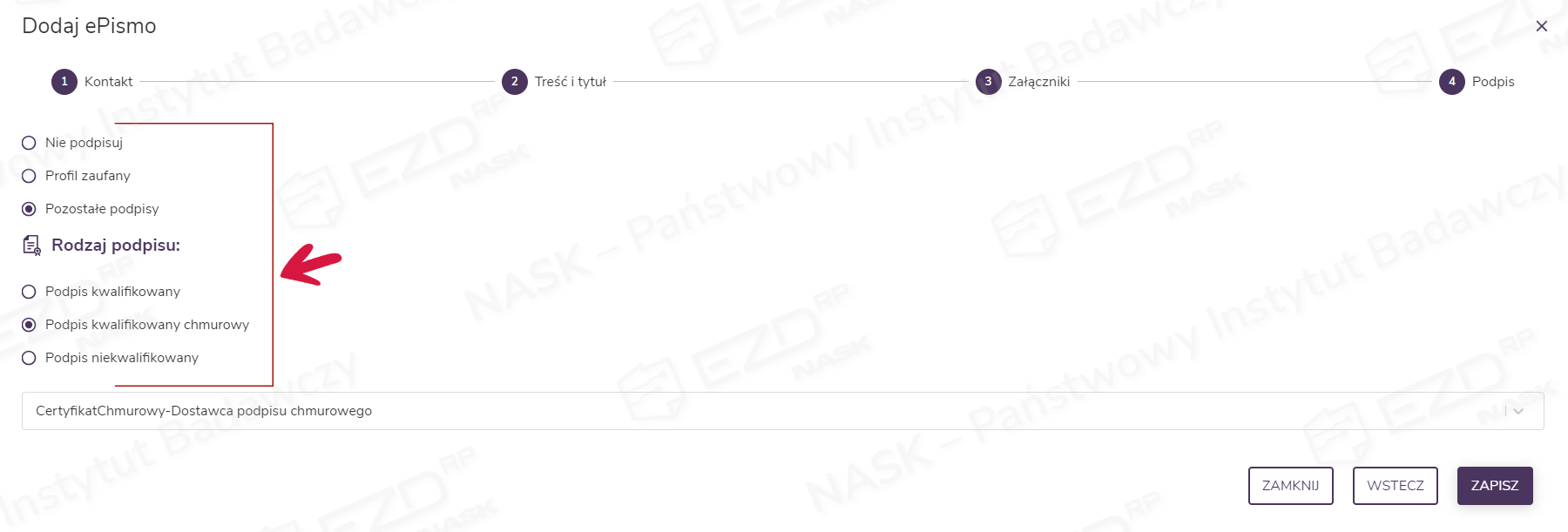 Po dokonaniu wyboru podpisu lub jego braku należy kliknąć przycisk Zapisz. Zakończy to tworzenie ePisma. W przypadku wskazania typu podpisu system pozwoli w tym momencie na jego wykonanie zgodnie z wybranym rodzajem (więcej o podpisywaniu ePisma w dalszej części artykułu).