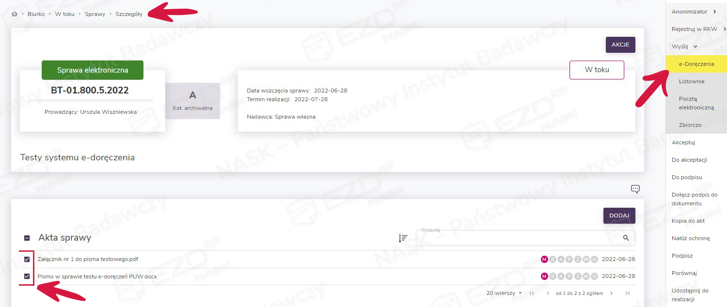 W systemie EZD RP czynność wysyłania korespondencji poprzez e-Doręczenia rozpoczynamy z poziomu szczegółów sprawy Biurko > W toku > Sprawy. Należy zaznaczyć pola wyboru przy dokumentach, które podlegają wysyłce. Następnie w menu kontekstowym widocznym w prawej części ekranu klikamy opcję Wyślij. Wyświetlona zostanie lista, na której dostępne są różne sposoby wysyłki. Należy wybrać e-Doręczenia.