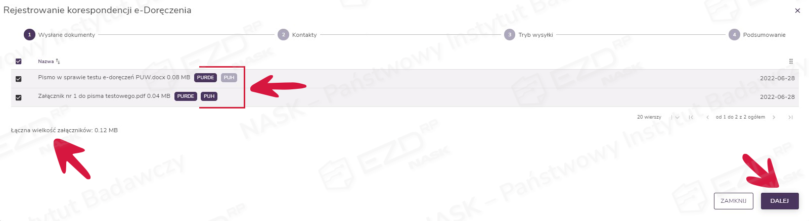W kolejnym oknie Rejestrowanie korespondencji e-Doręczenia widoczne są dokumenty wskazane do wysłania. Obok ich nazw (z prawej strony) pojawią się opcje wysyłki PURDEPUH.